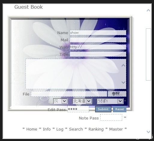 ゲストブック https://www.hassyi.com/abc/pjload/pjload.cgi スパム投稿防止用に@hassyiが改造した掲示板です。 お気兼ねなく書き込みをどうぞ! このCGIを配布もしています。 CSSが効いてない場合は互換表示をお試しください 背景画は毎日切り替わります。 互換モード 互換モードで見る火曜日の背景画 拍手 1