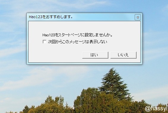 その状態で、hao123を検索すると、何かプログラムのインストール時にまぎれこんでいたとか