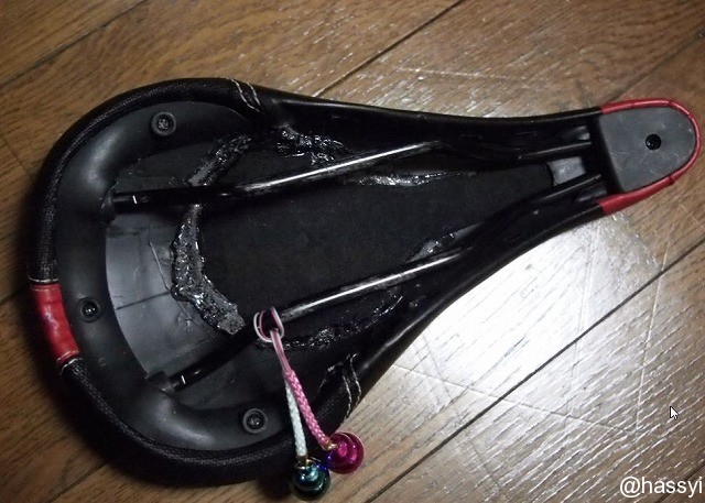 最初、このプラスチックをカットしてゆくと、サドルの薄いビニールシートとクッションのスポンジが見えますが、穴を開けたまま使用していると耐久性がなくなるので