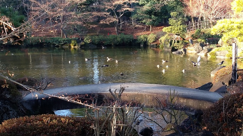 来るのは朝6時15分頃に自転車に乗って各池へ行ってカルガモたちへ餌巻きします。 鳩もおじさんのもとにたくさん集まってきます