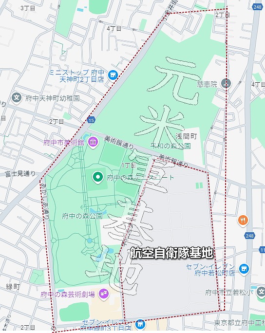 美術館通りを挟んで向こう側 平和の森公園の広大な敷地は