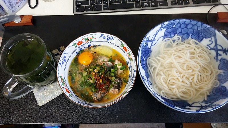 最後のイワシ缶に冷凍 きざみネギと平飼い生卵