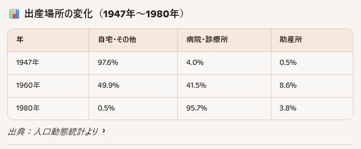 • 出産場所:清潔な医療施設で、医師や看護師が常駐する環境。1958年頃には病院出産が急増し、1960年には病院・診療所での出産が約41.5%に達しました。