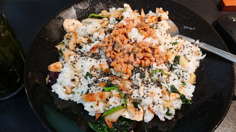 朝、蕎麦 必ず納豆を入れて表面に伸ばします。