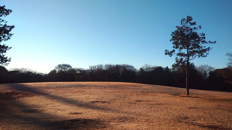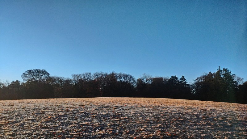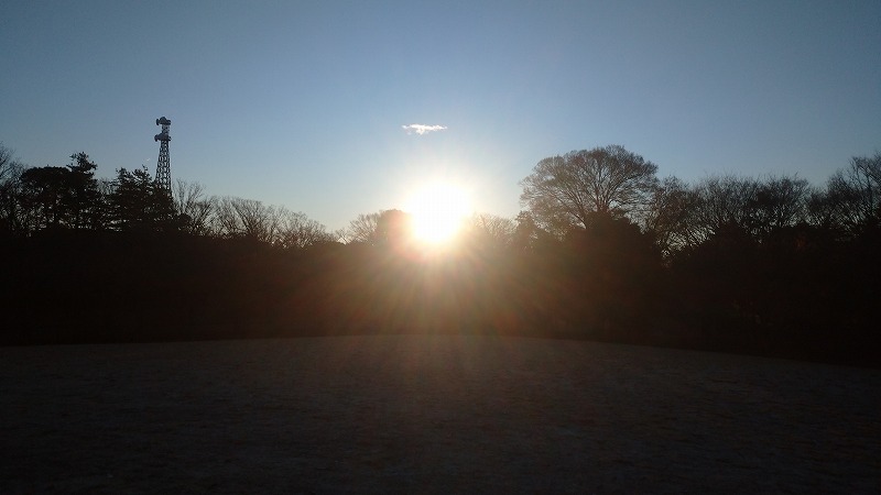その中間地点に若い女性が太陽に向かっているところ、まだ太陽が木々から上がってこない時間だが