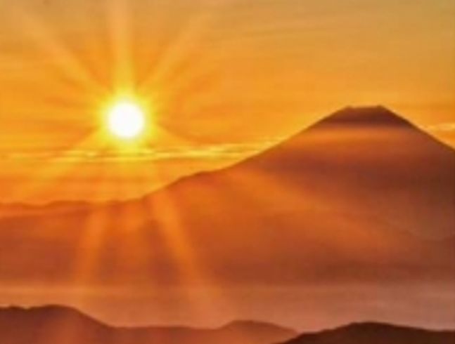 その集いで、多くの人の前に立って喋る人 講話など3名の顔写真と背景画が日の出の富士山でデザインされているパンフレット